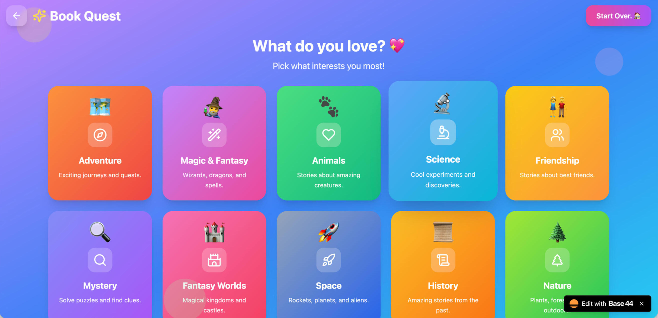 Problem: Children's reading rates are declining year-over-year.Solution: Enhancing the library book selection experience to be more personalized and engaging through relevant recommendations.Action: Using Base44, I developed a "digital kiosk" for children's libraries, allowing them to choose a category and discover popular books within that subject.