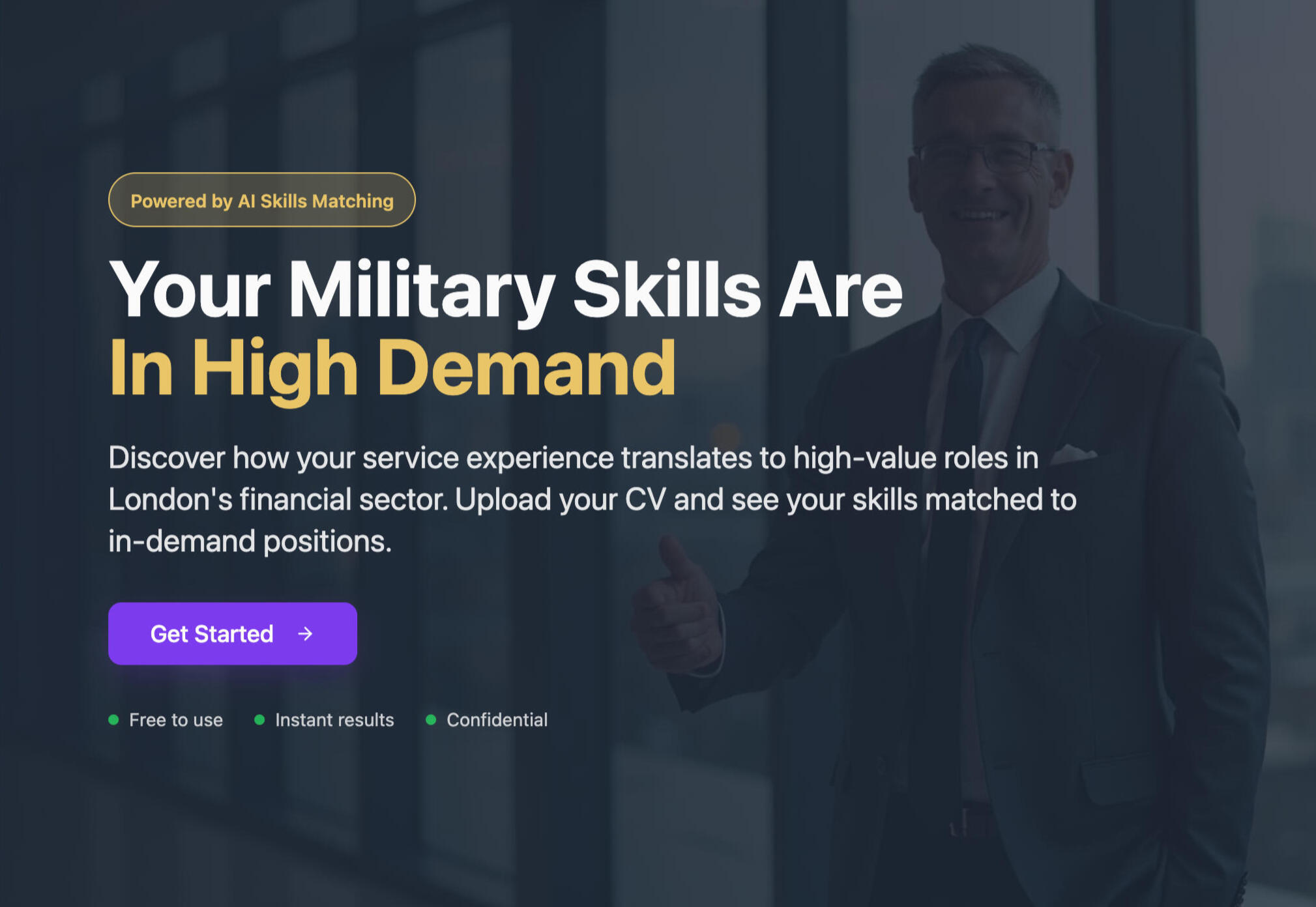Problem: Veterans and reservists encounter difficulties securing employment in the financial district.Solution: An application designed to bridge the gap between military skills and relevant financial sector job advertisements.Action: Utilizing Lovable, I developed an app to match military-experienced veterans with appropriate financial sector roles.